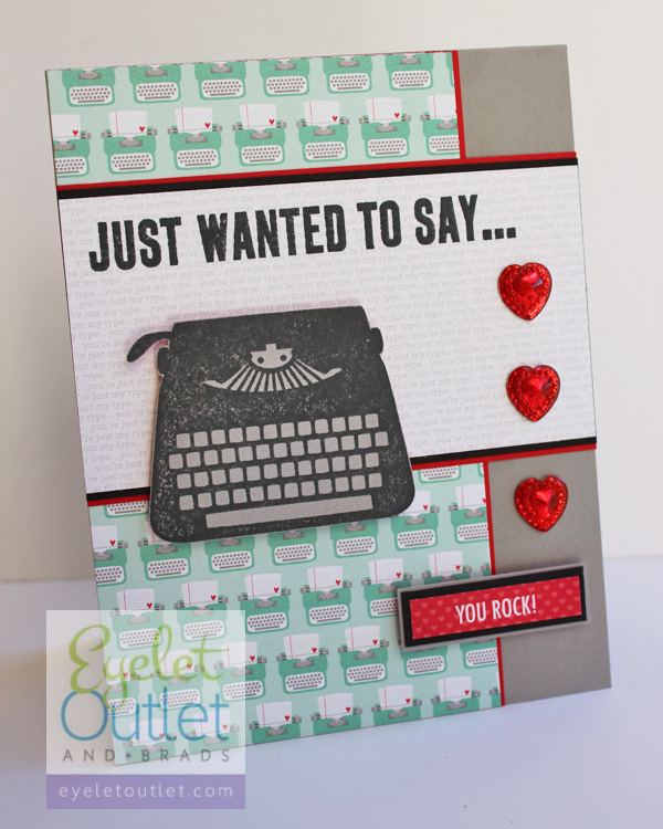 My second card includes a Gourmet Rubber Stamps typewriter and sentiment. I love the way the sticky backed hearts lead the eye to the phrase, "You Rock!" which is another one of the prefabs from the Doodlebug paper.