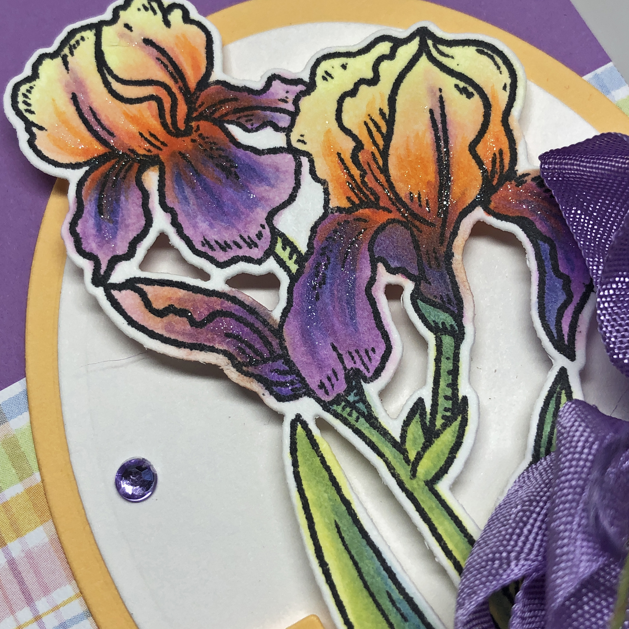 I have previously shared my fondness of irises because of a neighbor and friend of my mother's whose name was Iris, so I was really happy when Stamp Simply added an iris stamp bundle to their floral designs. When preparing today's card I searched online for a photo of an iris and found this beautiful example of a pale pink iris with a purple throat to use as inspiration. I love traditional colors but sometimes something a little unexpected can be lots of fun! Pastel pinks and periwinkle blues seemed so appropriate for a Mother's Day card. The colors are reflected in the coloring, the card stock, ribbon and rhinestones.